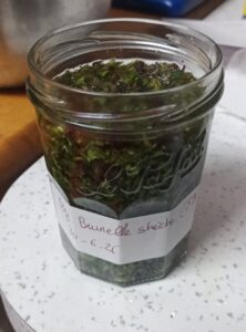 Couper les fleurs sèchées en petit, remplir le pot en verre en recouvrant réguièrement d’alcool.